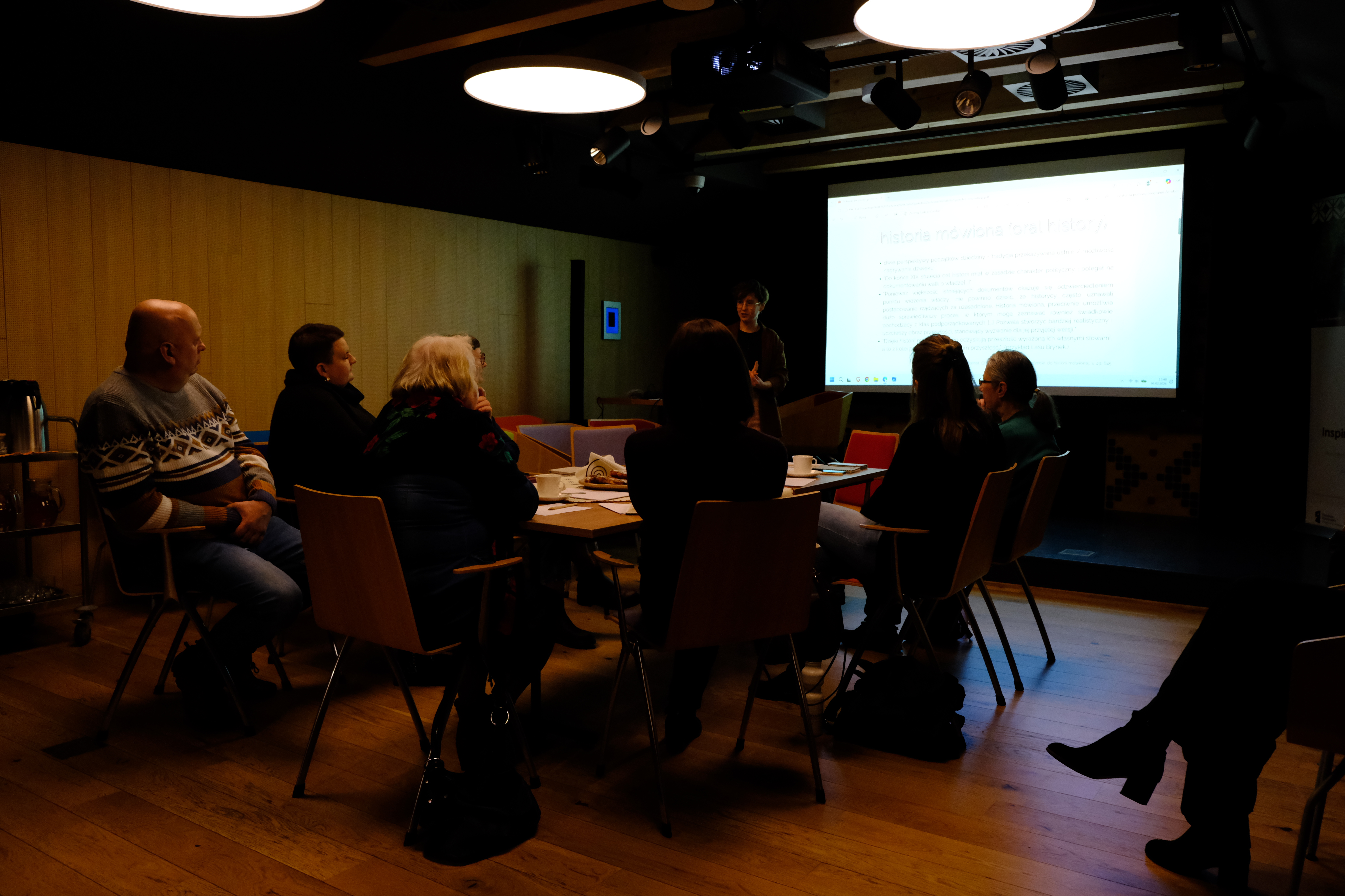 Część merytoryczną spotkań poprowadziła Aleksandra Karmelita, animatorka życia kulturalnego, entuzjastka i propagatorka nurtu historii mówionej. Podczas spotkań prowadzonych przez Aleksandrę, uczestnicy poznali historię mówioną od strony teoretycznej. W pierwszej części spotkań uczestnicy mieli również możliwość zastosowania zdobytej wiedzy w praktyce - odbywało się to w formie ćwiczeń polegających na nagrywaniu materiału audio przy użyciu profesjonalnych dyktafonów. Przeprowadzona próba dźwięku pozwoliła uczestnikom postawić pierwsze kroki w roli badaczy.