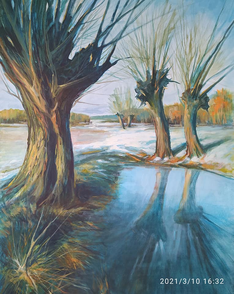 Głównym, choć nie jedynym, tematem obrazów malowanych w technice akrylowej jest pejzaż porośniętych wierzbami rozlewisk, charakterystyczny dla miejsca urodzenia artysty.
